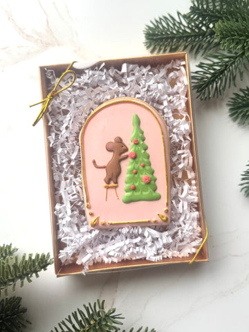 One cookie in a 5x7 box with a ribbon.